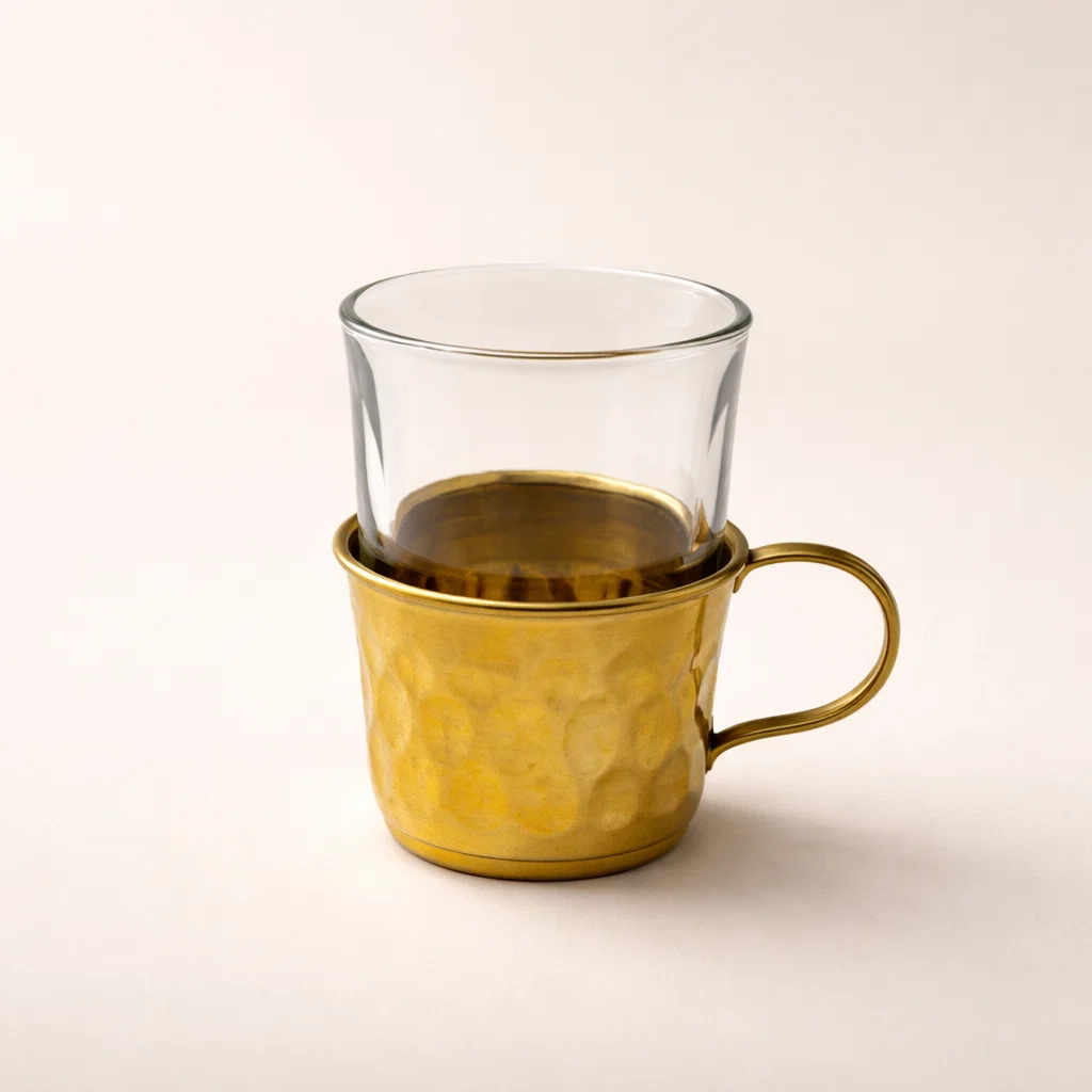 طقم ضيافة بسيط وشيك يرفع شكل التقديم فورًا: فنجان نحاس بتشطيب هاند ميد + كوب زجاج صغير لراحة الاستخدام ولمسة أنيقة. النحاس الصافي بيدي إحساس بالفخامة والطابع التراثي، والزجاج يضيف شكل مرتب وعملي للتقديم. مناسب للضيافة اليومية والمناسبات، وكمان اختيار ممتاز للهدايا لمحبي القطع النحاسية والستايل الكلاسيك.