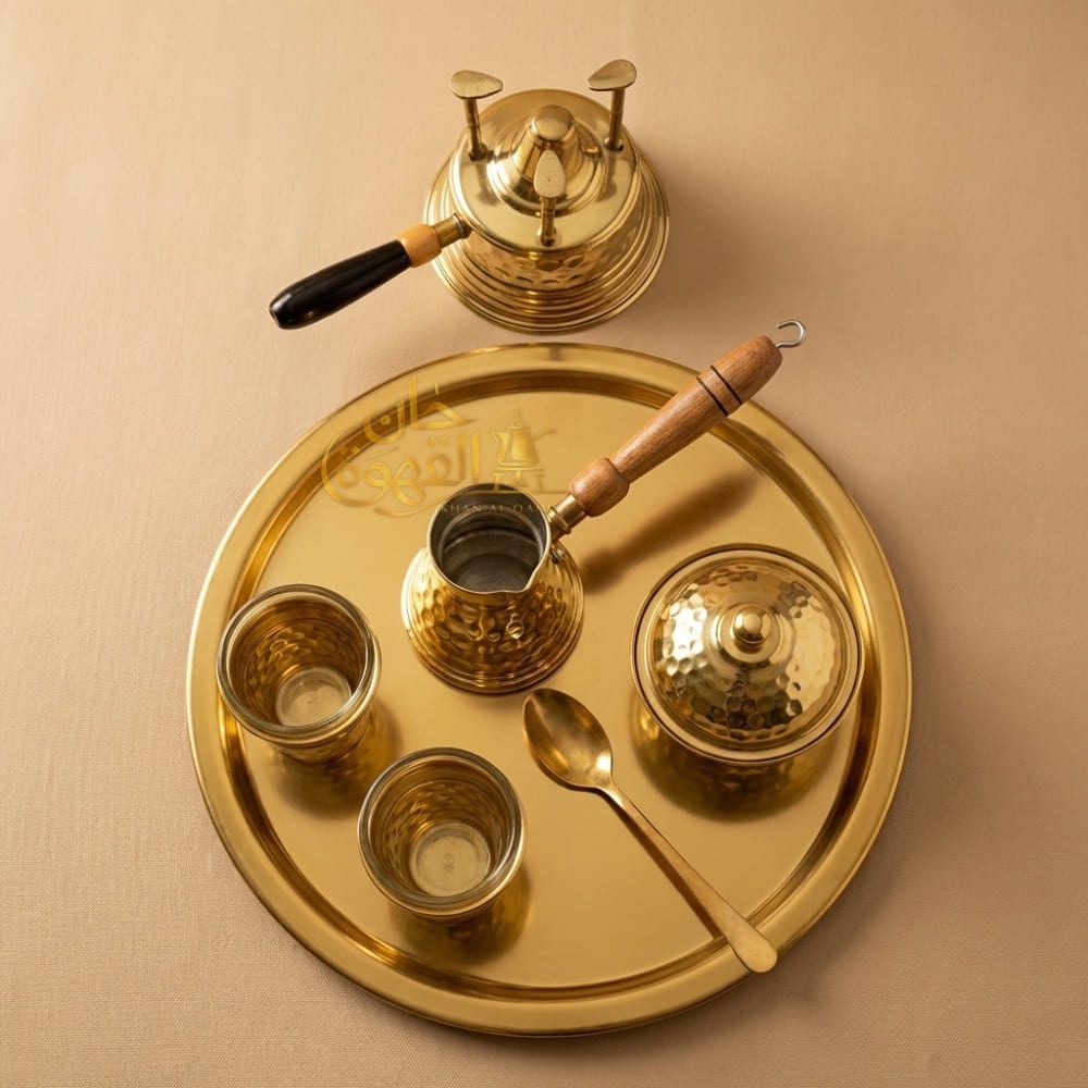 طقم قهوة نحاس منقوش فاخر كامل بتصميم أنيق وتشطيب عالي الجودة، مثالي للضيافة اليومية والعزومات وهدية مميزة تضيف لمسة فخامة وأصالة لركن القهوة عندك