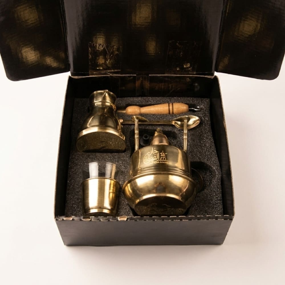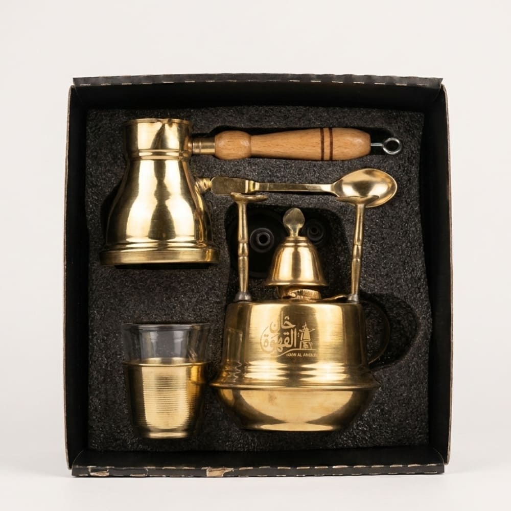 طقم قهوة نحاس سادة عالي الجودة مع حفر اسمك مجاناً. يشمل سبرتاية، كنكة، كوب، وملعقة. شحن مجاني اطلب هديتك الفريدة الآن من قلب مصر!